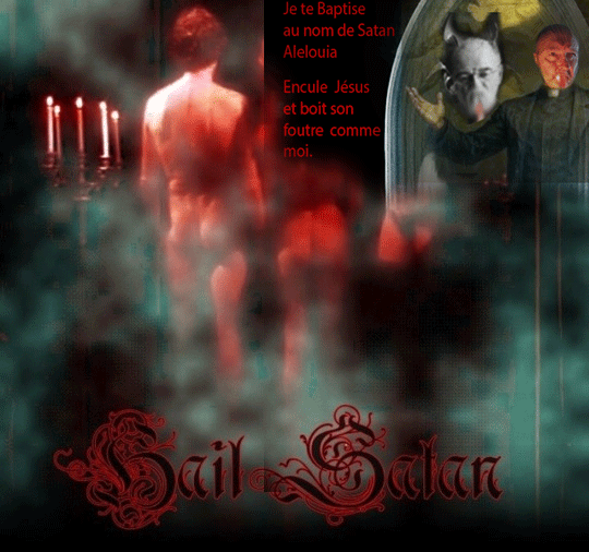 La luxure, la perversion et la corruption sont nos chevaux, la sodomie est notre comportement, l'homosexualité est notre plaisir et le diable est notre but. Entrez dans notre monde. Entrez dans le monde des ténèbres par la porte de mon cul. Mon cul est la porte par laquelle vous entrez dans notre monde. La clé de la porte est votre pénis. Vous avez tous les deux la clé et je possède la porte. Ouvrez la porte. Insérez vos clés dans ma cul et vous sentirez la présence de Satan entrer en vous...